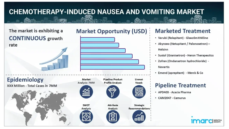 IMARC Groupの新報告書は、米国、EU4(ドイツ、スペイン、イタリア、フランス)、英国、日本における化学療法誘発性悪心・嘔吐市場について包括的な分析を提供しております。これには、治療実践、市場流通中および開発中の薬剤、個別療法のシェア、主要7市場における市場実績、主要企業とその薬剤の市場実績などが含まれます。本報告書では、主要7市場における現在および将来の患者数についても提示しております。