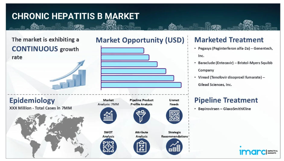 IMARC Groupの新報告書は、米国、EU4(ドイツ、スペイン、イタリア、フランス)、英国、日本における慢性B型肝炎市場について包括的な分析を提供しております。これには、治療実践、市場流通中および開発中の薬剤、個別療法のシェア、主要7市場における市場動向、主要企業とその薬剤の市場実績などが含まれます。また、主要7市場における現在および将来の患者数についても記載されております。本報告書によれば、米国は慢性B型肝炎の患者数が最も多く、その治療市場も最大規模を占めています。さらに、現在の治療実践/アルゴリズム、市場推進要因、課題、機会、償還シナリオ、未充足医療ニーズなども本報告書で提供されています。本報告書は、メーカー、投資家、ビジネス戦略家、研究者、コンサルタント、および慢性B型肝炎市場に関与している、あるいは何らかの形で参入を計画している全ての方にとって必読の資料です。