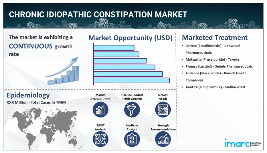 IMARC Groupの新報告書は、米国、EU4(ドイツ、スペイン、イタリア、フランス)、英国、日本における慢性特発性便秘市場について包括的な分析を提供しております。これには、治療実践、市場流通薬および開発中の薬剤、個別療法のシェア、主要7市場における市場実績、主要企業とその薬剤の市場実績などが含まれます。本報告書ではさらに、主要7市場における現在および将来の患者数についても提示しております。本報告書によれば、米国は慢性特発性便秘症の患者数が最も多く、治療市場としても最大規模を占めています。さらに、現在の治療実践/アルゴリズム、市場推進要因、課題、機会、償還シナリオ、未充足医療ニーズなども本報告書に記載されております。本報告書は、製造業者、投資家、ビジネス戦略家、研究者、コンサルタント、および慢性特発性便秘市場に関与している、あるいは参入を計画している全ての方にとって必読の資料です。
