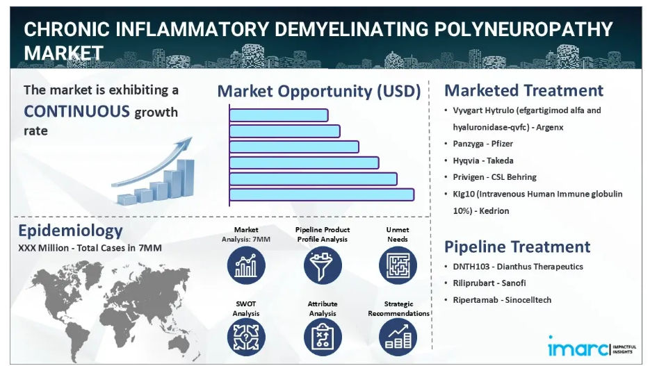 IMARC Groupの新報告書は、米国、EU5(ドイツ、スペイン、イタリア、フランス、英国)、および日本における慢性炎症性脱髄性多発神経炎市場について、包括的な分析を提供しております。これには、治療実践、市場流通中および開発中の薬剤、個別療法のシェア、主要7市場における市場動向、主要企業とその薬剤の市場実績などが含まれます。本レポートではさらに、主要7市場における現在および将来の患者数についても提示しております。