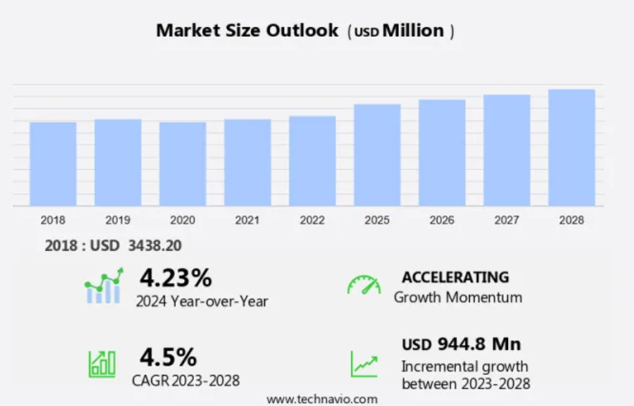 シトラスオイル市場規模は、2023年から2028年の間にCAGR 4.5%で9億4480万米ドル増加すると予測されています。市場は、特に食品や飲料製品など、さまざまな業界で天然成分ベースの製品の採用が増加しているため、大幅な成長を遂げています。消費者がより健康的な代替品を求める傾向にあるため、レモンのエッセンシャルオイルやオレンジオイルなどのオーガニックシトラスオイルの需要は増加しています。しかし、これらのオイルは高価で腐りやすいため、市場の成長には課題があります。さらに、合成シトラスフレーバーや、着色料や機能性食品成分として使用されるその他の植物抽出物などの代替製品の入手可能性が、市場での競争を激化させています。また、シトラスオイル市場は、これらのオイルがフレグランスで使用されるケースが増えていることにも影響を受けており、それによって用途と潜在的な市場規模がさらに拡大しています。