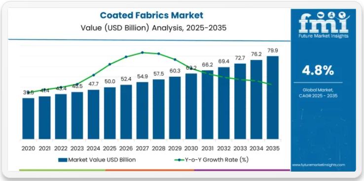 コーティング生地市場は、2025年の500億米ドルから2035年には799億米ドルへ成長し、年平均成長率(CAGR)4.8%を記録すると予測されています。飽和点分析では、市場の成熟段階に近づく時期を検証する。この段階では普及が進み需要の伸びが限定されるため成長が鈍化する。2025年から2030年までの初期段階では、自動車、建設、防護服、産業分野での用途拡大により市場は着実な成長を続ける見込みである。防水性・耐久性・軽量性を備えた生地への需要増加が成長を支え続けるため、この期間中は飽和状態には至らないと予測される。