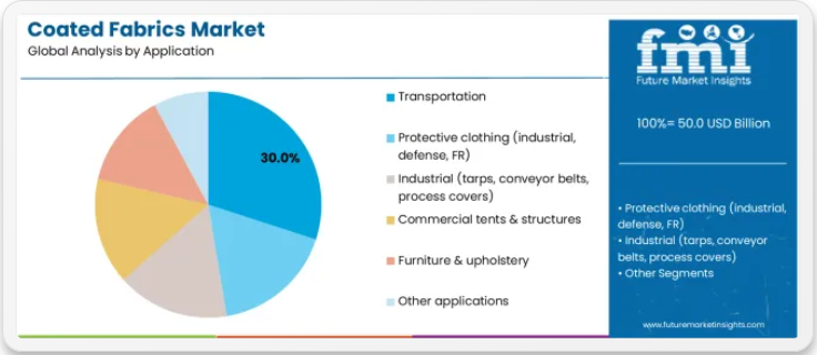 主要分類:市場は用途別に輸送、防護服、産業用、商業用テント・構造物、家具・室内装飾、その他用途に分類され、基本的な防水シートから包括的な機能性能を備えた特殊エンジニアリングテキスタイルへの進化を反映。