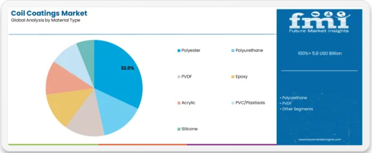 ポリエステルセグメントは2025年にコイルコーティング市場の32.0%を占めると予測され、主要素材タイプカテゴリーとしての地位を再確認しています。建築製品メーカーや金属コーティング業者は、優れたコストパフォーマンス、良好な耐候性、豊富なカラーバリエーション、建築用金属屋根・壁パネル・工業用金属製品など幅広い用途への適応性から、ポリエステルコイルコーティングの利用を拡大しています。ポリエステルコーティング技術の実証済み耐久性と経済的価値は、穏やかな気候条件下での用途や標準的な建築環境における信頼性の高い性能を競争力のある価格で求める建材業界の要求に直接応えるものである。