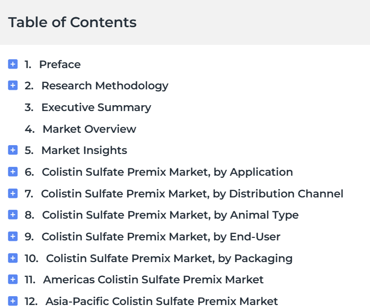 本レポートでは、コリスチン硫酸塩プレミックス市場における最近の重要な動向を掘り下げ、主要ベンダーとその革新的なプロフィールを強調しています。 これらには、Cargill, Incorporated、Ceva Santé Animale、East Hope Group、Elanco Animal Health Incorporated、Huvepharma Inc.、JEFO Nutrition Inc.、Kemin Industries, Inc.、Merck & Co., Inc.、Nutreco N. V., Phibro Animal Health Corporation, QualiTech Inc., Vetoquinol S.A., Virbac Group, Zhejiang Hisun Pharmaceutical Co., Ltd., and Zoetis Inc.