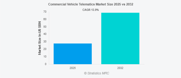 Stratistics MRCによると、商用車テレマティクスの世界市場は2025年に276億7000万ドルを占め、予測期間中の年平均成長率は13.9%で、2032年には688億3000万ドルに達する見込みです。商用車テレマティクスは、通信技術とITシステムを組み合わせ、車両運行を効率的に管理・最適化します。これには、GPSベースの追跡、リアルタイムのモニタリング、車両性能診断、ドライバーの行動分析などが含まれます。これらのシステムにより、企業は燃費効率を高め、運営経費を削減し、安全性を向上させ、規制を遵守することができます。さらに、テレマティクスは予知保全、ルート計画、車両問題の即時アラートをサポートし、ダウンタイムと運行中断を削減します。輸送業界がコネクテッドでインテリジェントなソリューションをますます優先するようになるにつれ、商用車テレマティクスは、車両効率の向上、環境への影響の最小化、全体的な生産性の向上において重要な役割を果たすようになり、現代の物流および車両管理企業にとって重要なツールとなっています。