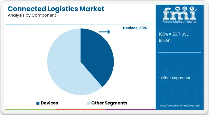 デバイスセグメントは、フリート管理、倉庫管理、在庫追跡におけるIoTセンサーの広範な導入を背景に、2025年に接続型物流市場の最大シェア(38.6%)を占める。これらのデバイスは、物流効率に不可欠なリアルタイム監視、環境制御、予知保全を可能にする。