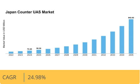 日本の対UAS市場は、技術進歩と安全保障上の懸念の高まりを背景に、2024年から2035年にかけて24.98%のCAGRで成長すると予測される。