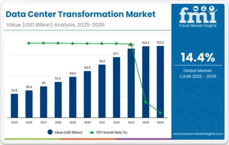 世界のデータセンター変革市場は、2025年に345億6,000万米ドルから2035年までに1,032億6,000万米ドルに成長すると予測されています。これは14.4%という堅調な年平均成長率(CAGR)を示しています。BFSI(銀行・金融サービス・保険)、医療、ITなどの業界におけるクラウドコンピューティングとデジタルトランスフォーメーションの取り組みの加速的な採用が、この急速な拡大を牽引している。