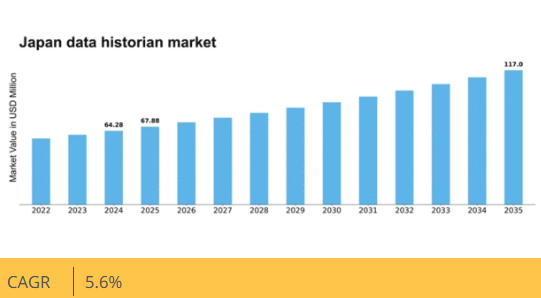 マーケットリサーチフューチャーの分析によると、2024年の日本のデータヒストリアン市場規模は6428万米ドルと推定された。日本のデータヒストリアン市場は、2025年の67.88百万米ドルから2035年までに117.0百万米ドルへ成長し、予測期間(2025年~2035年)において年平均成長率(CAGR)5%を示すと予測されている。