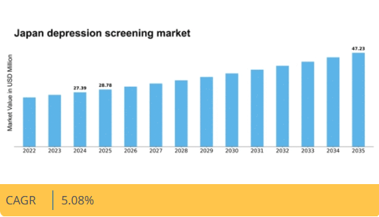 日本のうつ病スクリーニング・メンタルヘルス市場は、認知度向上と技術進歩を原動力に、2024年から2035年にかけて年平均成長率(CAGR)5.08%で成長すると予測される。