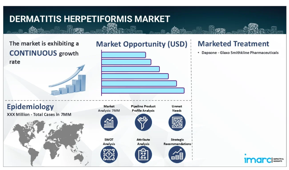 IMARC Groupの新報告書は、米国、EU5(ドイツ、スペイン、イタリア、フランス、英国)、および日本における皮膚ヘルペス様皮膚炎市場について、包括的な分析を提供します。これには、治療実践、市場流通中および開発中の薬剤、個別療法のシェア、7大市場における市場動向、主要企業とその薬剤の市場実績などが含まれます。本レポートではさらに、7大市場における現在および将来の患者層についても提示しております。
