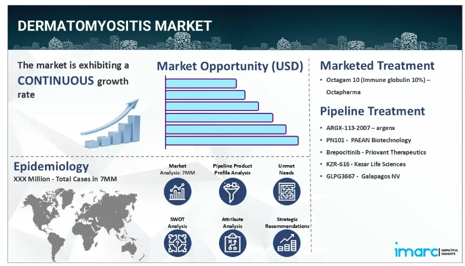 IMARC社の新報告書「皮膚筋炎市場規模、疫学、市場内医薬品売上高、開発中の治療法、および地域別展望 2025-2035年」において、皮膚筋炎市場が包括的に分析されております。皮膚筋炎は、主に筋肉と皮膚に影響を及ぼす希少な自己免疫疾患です。症状としては、特に腕や脚の近位筋における筋力低下や痛みが典型的に見られます。また、顔面、眼瞼、指関節などに発疹が現れることが多く、これにはしばしば発赤や腫脹が伴います。