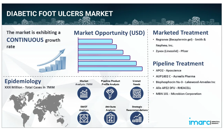 IMARC Groupの新報告書は、米国、EU4(ドイツ、スペイン、イタリア、フランス)、英国、日本における糖尿病性足潰瘍市場について包括的な分析を提供しております。これには、治療実践、市場流通中および開発中の薬剤、個別療法のシェア、主要7市場における市場動向、主要企業とその薬剤の市場実績などが含まれます。また、主要7市場における現在および将来の患者数についても記載されております。本報告書によれば、米国は糖尿病性足潰瘍の患者数が最も多く、治療市場としても最大規模を占めています。さらに、現行の治療実践/アルゴリズム、市場推進要因、課題、機会、償還状況、未充足医療ニーズなども本報告書で提供されています。本報告書は、製造業者、投資家、ビジネス戦略家、研究者、コンサルタント、および糖尿病性足潰瘍市場に関与している、あるいは参入を計画している全ての方にとって必読の資料です。