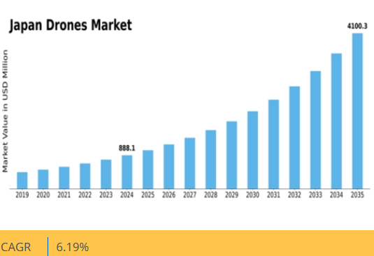 日本ドローン市場は、技術進歩・規制支援・多分野での応用拡大を背景に、2025年から2035年にかけて年平均成長率6.19%で拡大すると予測される。