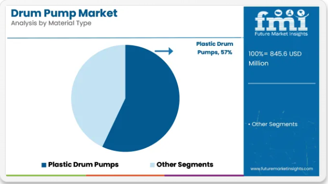プラスチック製ドラムポンプは2025年に世界市場シェアの57%を占め、2035年まで年平均成長率(CAGR)4.5%で成長すると予測されている。その優位性は、酸・アルカリ・溶剤の安全な移送が求められる環境における、優れた耐薬品性、低腐食リスク、取り扱い容易さに起因する。