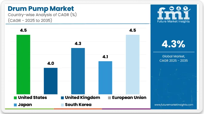 韓国のドラムポンプ市場は、急速な工業化、化学・半導体業界の拡大、自動化流体処理システムの導入により活況を呈している。韓国が電子・化学製造業の主要プレイヤーであることから、半導体および特殊化学用途向け高純度ドラムポンプへの需要が高い。