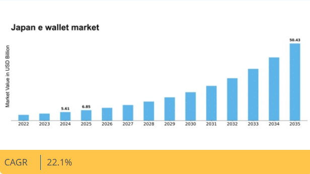 日本の電子財布市場は、デジタル決済の普及拡大と技術進歩を背景に、2024年から2035年にかけて年平均成長率(CAGR)22.1%で成長すると予測される。