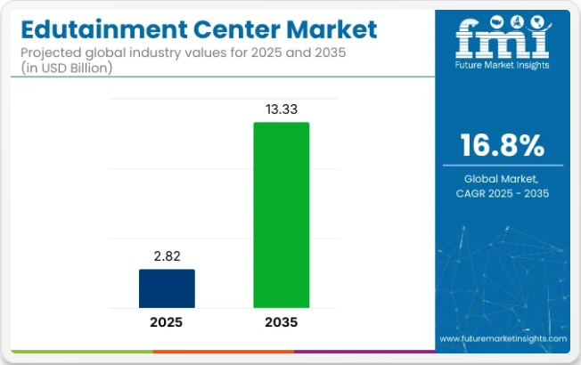世界のエデュテインメントセンター市場は2025年に28億2000万米ドルの規模となり、2035年までに133億3000万米ドルに達すると予測されており、予測期間中のCAGRは16.8%を示しています。この大幅な成長は、教育と娯楽を融合した没入型・双方向型学習体験への需要増加によって牽引されています。