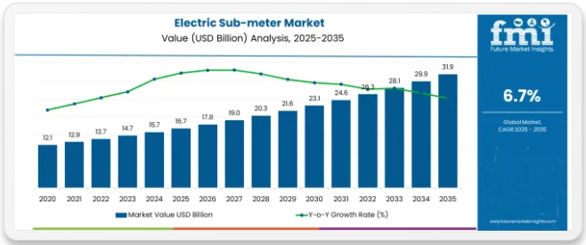 世界の電気サブメーター市場は、2025年に167億米ドルと評価され、2035年までに319億米ドルに達すると予測されており、予測期間中に152億米ドルの絶対増加を記録する見込みです。これは総成長過程91.1%に相当し、2025年から2035年にかけて市場は年平均成長率(CAGR)6.7%で拡大すると予測される。同期間中に市場規模は約1.9倍に成長すると見込まれており、これは電力網インフラのデジタル化進展、都市化需要の高まり、多様なエネルギー管理用途におけるスマートシティプログラムの普及拡大に支えられる。