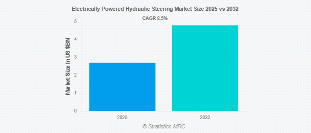 Stratistics MRCによると、電動油圧ステアリングの世界市場は2025年に27億ドルを占め、予測期間中の年平均成長率は8.5%で、2032年には48億ドルに達する見込みです。電動油圧ステアリングは、車両や機械の動きを制御するために電気モーターと油圧システムを組み合わせたハイブリッドステアリング技術です。特に大型車やオフロード車において、ステアリングの精度、応答性、エネルギー効率を高めます。このシステムは、従来の油圧ステアリングと比較して、エンジン負荷と燃料消費を削減します。農業、建設、自動車分野で一般的なこのシステムは、より安全で信頼性の高い運転に貢献し、多くの場合、自律走行またはアシスト運転機能をサポートします。