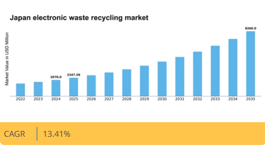 日本の電子廃棄物リサイクル市場は、規制支援、技術進歩、消費者意識の高まりを背景に、2024年から2035年にかけて年平均成長率(CAGR)13.41%で成長が見込まれています。