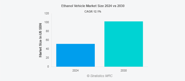 Stratistics MRCによると、世界のエタノール自動車市場は2024年に515億ドルを占め、予測期間中の年平均成長率は12.1%で、2030年には1,023億ドルに達する見込みです。エタノールを主成分とする燃料、主にE85(エタノール85%とガソリン15%の混合燃料)または純粋なエタノール(E100)で走行する自動車は、エタノール自動車として知られています。これらの自動車は、エタノールの腐食性の影響を受けにくい特殊な燃料システムと部品とともに、適合した内燃エンジンを備えています。化石燃料の持続可能な代替品であるエタノールは、トウモロコシやサトウキビなどの作物から作られ、温室効果ガスの排出を抑えます。しかし、エタノールはエネルギー含有量が少ないため、ガソリンよりも燃費が少し悪い。