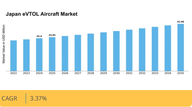 日本のeVTOL航空機市場は、技術進歩・都市化・規制支援を原動力に、2024年から2035年にかけて年平均成長率3.37%で拡大すると予測される。