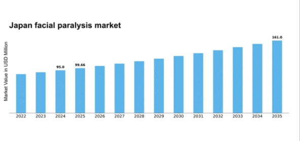 MRFRの分析によると、2024年の日本の顔面神経麻痺市場規模は95.0百万ドルと推定された。日本の顔面麻痺市場は、2025年の99.66百万ドルから2035年までに161.0百万ドルへ成長し、予測期間(2025年~2035年)において年平均成長率(CAGR)4.91%を示すと予測されている。