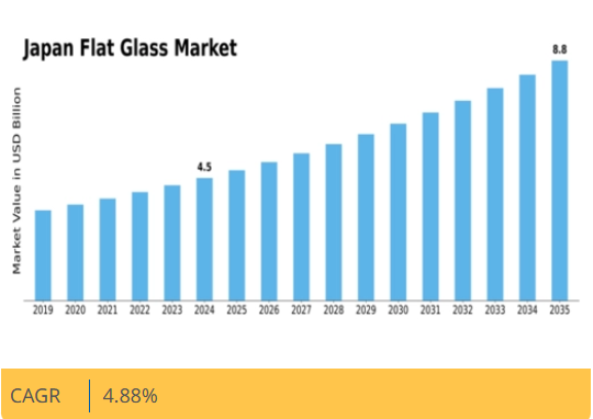 日本のフラットガラス市場は、建設・自動車分野での需要増加を背景に、2024年から2035年にかけて年平均成長率(CAGR)4.88%で成長すると予測される。
