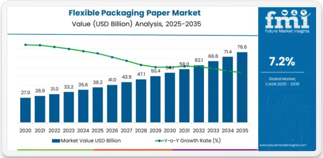 世界のフレキシブル包装紙市場は、2025年に382億米ドルと評価され、2035年までに766億米ドルに達すると予測されており、予測期間中に382億米ドルの絶対的な増加を記録する見込みです。これは総成長過程100.0%に相当し、2025年から2035年にかけて市場は年平均成長率(CAGR)7.20%で拡大すると予測される。