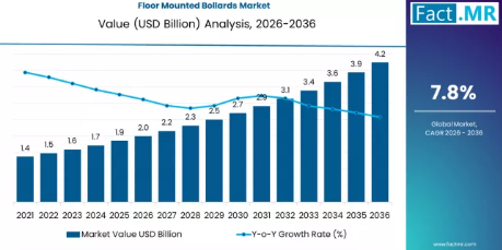 世界の床設置型ボラード市場は、2026年の20億米ドルから2036年までに42億米ドルへと成長すると予測されており、2026年から2036年までの年間平均成長率(CAGR)は7.8%となります。これは、総成長率95.0%に相当します。自動格納式ボラードのセグメントは、2026年には床設置型ボラード市場全体の39.6%を占める見込みです。