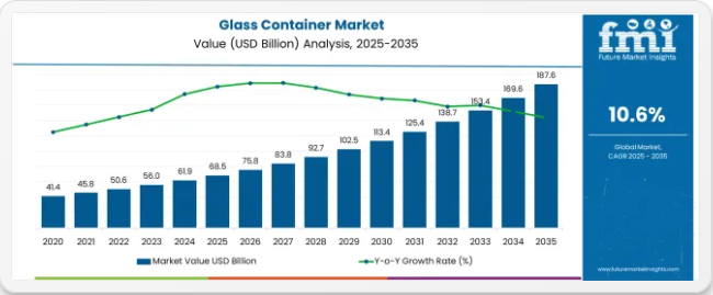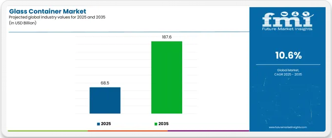 世界のガラス容器市場は、2025年の685億米ドルから2035年までに約1,876億米ドルへ成長し、予測期間中に1,188億米ドルの絶対増加を記録すると予測されています。これは総成長過程173.4%に相当し、2025年から2035年にかけて市場は年平均成長率(CAGR)10.6%で拡大すると予測される。同期間中に市場規模は約2.7倍に成長すると見込まれており、その背景にはプレミアム包装ソリューションへの需要増加、飲料・食品業界における採用拡大、そして世界の消費財・小売セクター全体で高まる環境配慮型包装代替品への要求がある。ガラス容器市場のクイック統計ガラス容器市場規模(2025年):685億米ドルガラス容器市場予測規模(2035年):1,876億米ドルガラス容器市場予測CAGR:10.6%ガラス容器市場における主要製品カテゴリー:ボトル(58%)ガラス容器市場の主要な成長過程地域:北米、ヨーロッパ、アジア太平洋ガラス容器市場の主要企業:オーウェンズ・イリノイ社、アルダー・グループ、ヴェラリア、ビドララ社、ゲレスハイマー社