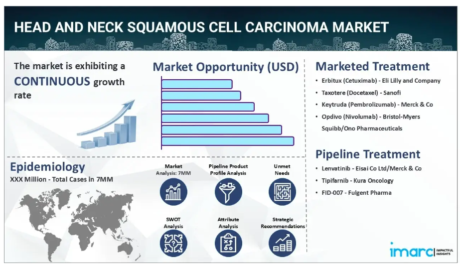 IMARC Group の新報告書は、米国、EU4(ドイツ、スペイン、イタリア、フランス)、英国、および日本における頭頸部扁平上皮癌市場について、包括的な分析を提供しております。これには、治療実践、市場流通中および開発中の薬剤、個別療法のシェア、7大市場における市場動向、主要企業とその薬剤の市場実績などが含まれます。本レポートではさらに、7大市場における現在および将来の患者数についても提示しております。レポートによれば、米国は頭頸部扁平上皮癌の患者数が最も多く、その治療市場においても最大規模を占めております。さらに、現在の治療実践/アルゴリズム、市場推進要因、課題、機会、償還シナリオ、未充足医療ニーズなども本報告書で提供されています。本報告書は、メーカー、投資家、ビジネス戦略家、研究者、コンサルタント、および頭頸部扁平上皮癌市場に関与している、あるいは参入を計画している全ての方にとって必読の資料です。