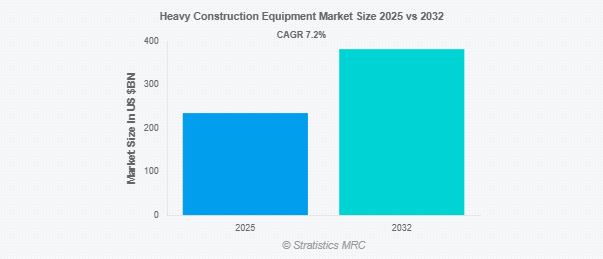 Stratistics MRCによると、世界の重建設機械市場は2025年に2,349億ドルを占め、予測期間中の年平均成長率は7.2%で、2032年には3,821億7,000万ドルに達する見込みです。マテリアルハンドリング、リフティング、解体、土木作業などの建設活動を目的とした多種多様な大型機械や車両を重建設機械と呼びます。これらの機器には、ローダー、クレーン、バックホー、掘削機、ブルドーザーが含まれ、建物、橋、トンネル、その他のインフラの建設に不可欠です。建設重機は、耐久性と効率を最大限に高めるよう設計されており、現場の生産性と安全性を高めています。