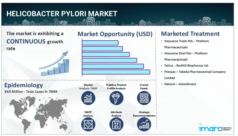 IMARC Groupの新報告書は、米国、EU4(ドイツ、スペイン、イタリア、フランス)、英国、日本におけるヘリコバクター・ピロリ市場について包括的な分析を提供しております。これには、治療実践、市場流通中および開発中の薬剤、個別療法のシェア、主要7市場における市場動向、主要企業とその薬剤の市場実績などが含まれます。また、主要7市場における現在および将来の患者数についても記載されております。本報告書によれば、米国はヘリコバクター・ピロリ症の患者数が最も多く、治療市場としても最大規模を占めています。さらに、現在の治療実践/アルゴリズム、市場推進要因、課題、機会、償還シナリオ、未充足医療ニーズなども本報告書で提供されています。本報告書は、製造業者、投資家、ビジネス戦略家、研究者、コンサルタント、ならびにヘリコバクター・ピロリ市場に関与している、または参入を計画している全ての方にとって必読の資料です。