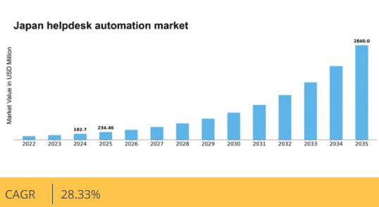 日本のヘルプデスク自動化市場は、技術進歩と効率性への需要増加を背景に、2025年から2035年にかけて年平均成長率(CAGR)28.33%で成長すると予測される。