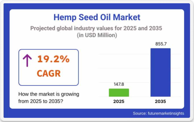 世界のヘンプシードオイル市場は2025年に1億4780万米ドルの規模となり、2035年までに8億5570万米ドルに達すると予測されており、これは年平均成長率(CAGR)19.2%を示しています。この成長過程は、化粧品、パーソナルケア、食品・飲料、栄養補助食品業界における需要増加によって牽引されている。