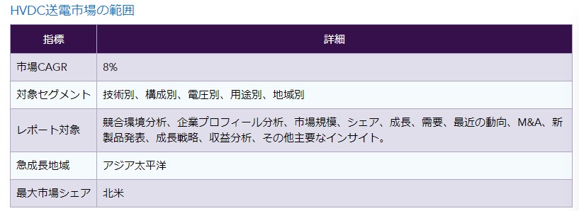 この調査レポートは、世界のHVDC送電市場規模、シェア、最新動向、競合情報、今後の市場展望を分析・予測したものです。 アジア太平洋地域のエネルギー・電力向け需要が増加。日立エナジー、シュナイダーエレクトリック、NRエレクトリックなどが参入し競争激化