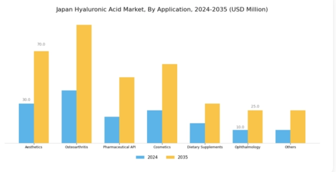 肌の健康と美容に関する消費者意識の高まりは、日本のヒアルロン酸市場における重要な推進要因です。スキンケア成分の効能に関する知識が深まるにつれ、ヒアルロン酸含有製品の需要は急増する見込みである。この化合物は保湿力、肌の弾力性向上、小じわの軽減効果で認知されている。結果として、ヒアルロン酸ベース製品の市場は成長が見込まれ、年間15%の潜在的増加が予測されている。さらに、スキンケアブランドによる教育キャンペーンがこの傾向を後押ししている。各種処方におけるヒアルロン酸の有効性を強調することで、ヒアルロン酸市場における消費者基盤を拡大しているのだ。