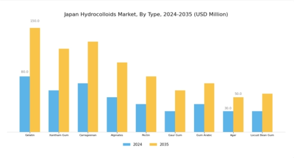 日本のハイドロコロイド市場は多様性に富み、進化を続ける分野であり、食品、医薬品、化粧品など様々な産業で異なる用途に用いられる多様なタイプが特徴である。この市場における主要プレイヤーであるゼラチンは、そのゲル化、増粘、安定化特性により、菓子、乳製品、デザート製造において不可欠な役割を果たしている。一方、キサンタンガムは優れた増粘能力で重要視され、グルテンフリー製品に広く使用されている。日本の食習慣の変化に伴い、市場成長を促進している。