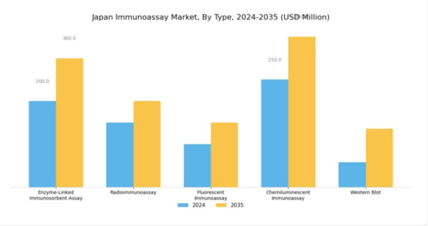 政府の支援は、日本の免疫測定市場の成長において重要な役割を果たしています。医療インフラの強化や診断技術の研究開発促進を目的とした様々な施策が実施されている。例えば、日本政府は免疫測定を含む革新的な医療技術支援のために多額の資金を割り当てている。この財政的支援は、アッセイ開発の進展を促進し、診断検査へのアクセス向上につながると期待されている。さらに、疾病予防と早期発見に焦点を当てた公衆衛生キャンペーンは、免疫測定製品の需要を牽引し、市場成長を促進する可能性が高い。