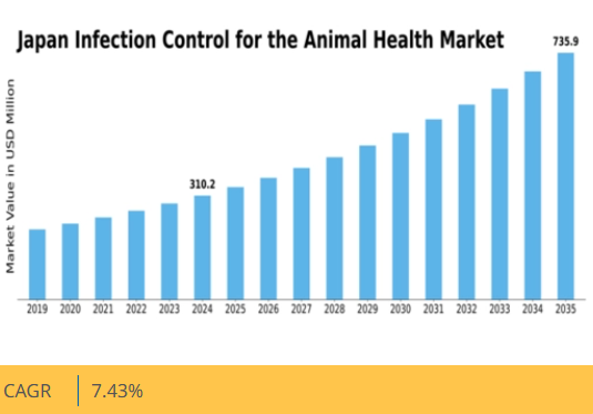 日本の動物健康管理向け感染制御市場は、技術進歩と動物健康への意識向上を原動力に、2024年から2035年にかけて年平均成長率(CAGR)7.43%で成長が見込まれる。