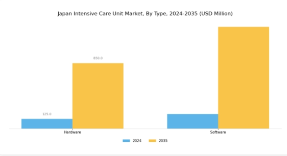 日本の集中治療室(ICU)市場は、ハードウェアやソフトウェアといった重要要素を含む多様なタイプに焦点を当てています。これらは集中治療サービスの能力と効率性を高める上で極めて重要な役割を果たします。これらのコンポーネント市場は、患者の治療成果向上と病院運営の効率化を可能にする先進医療技術への需要拡大によって牽引されています。近年では、人工呼吸器、モニタリングシステム、輸液ポンプなどの高度なハードウェアの統合が顕著な傾向となっています。
