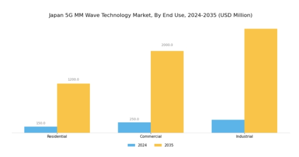 日本の5Gミリ波技術市場は著しい成長を遂げており、特にエンドユース分野が市場全体の動向形成において重要な役割を果たしています。家庭用分野では、スマートホーム機器や高速インターネットの普及が進み、高度な接続ソリューションへの需要が高まることで注目度が増しています。商業分野では、企業が5G技術を活用して業務効率化、顧客体験の向上、様々な産業におけるイノベーション促進を図り、デジタル化への移行を推進しています。