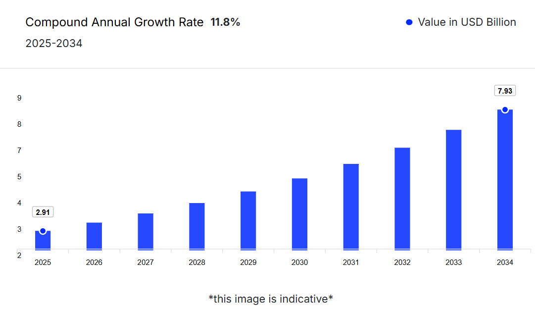 産業は、2025年から2034年までの予測期間中に年平均成長率(CAGR)11.80%で成長し、2034年までに79億3,000万米ドルの価値に達すると見込まれています。