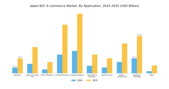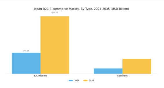 消費者がスマートフォンで買い物をする機会が増えるにつれ、モバイルコマースは世界の日本のB2C電子商取引市場産業における主要な推進要因となっています。2024年にはモバイルコマースが電子商取引総売上高の50%以上を占め、消費者の行動がモバイル対応プラットフォームへ移行していることを反映しています。この傾向は今後も継続すると予想され、2035年までに市場規模が5413億2000万米ドルに拡大するとの予測もあります。モバイルアプリやレスポンシブウェブサイトの利便性はユーザー体験を向上させ、購入頻度の増加を促します。小売業者はこの成長分野を捉えるためモバイル最適化に投資しており、これによりコンバージョン率や顧客ロイヤルティの向上が見込まれます。
