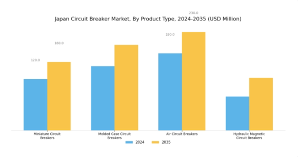 再生可能エネルギー源への移行は、遮断器市場に大きな影響を与えています。日本が太陽光、風力、その他の持続可能なエネルギー技術に投資するにつれ、変動するエネルギー入力を効率的に管理できる遮断器の必要性がより顕著になってきています。この移行は、製品設計における革新と適応を促進する可能性が高いです。
