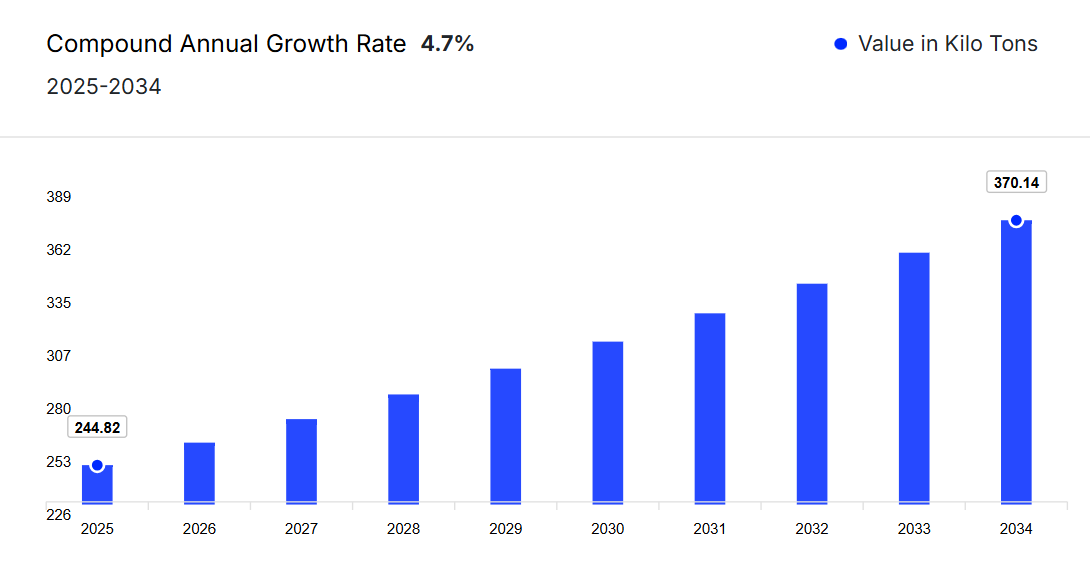 2025年から2034年の予測期間において、市場は健全な成長を遂げ、2034年には約370.14キロトンに達すると見込まれています。