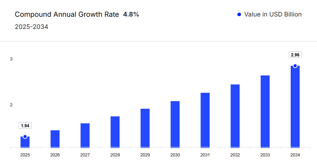 2025年から2034年までの予測期間において、産業は年平均成長率(CAGR)4.80%で成長し、2034年までに29億6,000万米ドルに達すると見込まれています。